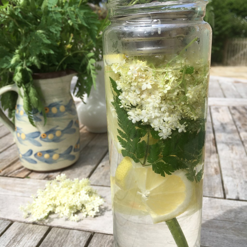 My favourite method is to infuse water with fresh herbs, fruit and flowers. I use a bottle that comes with its own filter. At the start of the day, seasonal edibles are added, such as elderflowers, roses, sweet cicely and lemon slices. This makes an instant, sugar-free summer cordial, (Note about elder: just use the flowers, with the fine stems that connect them; discard leaves and thicker stems. With sweet cicely, the whole plant can be used.)