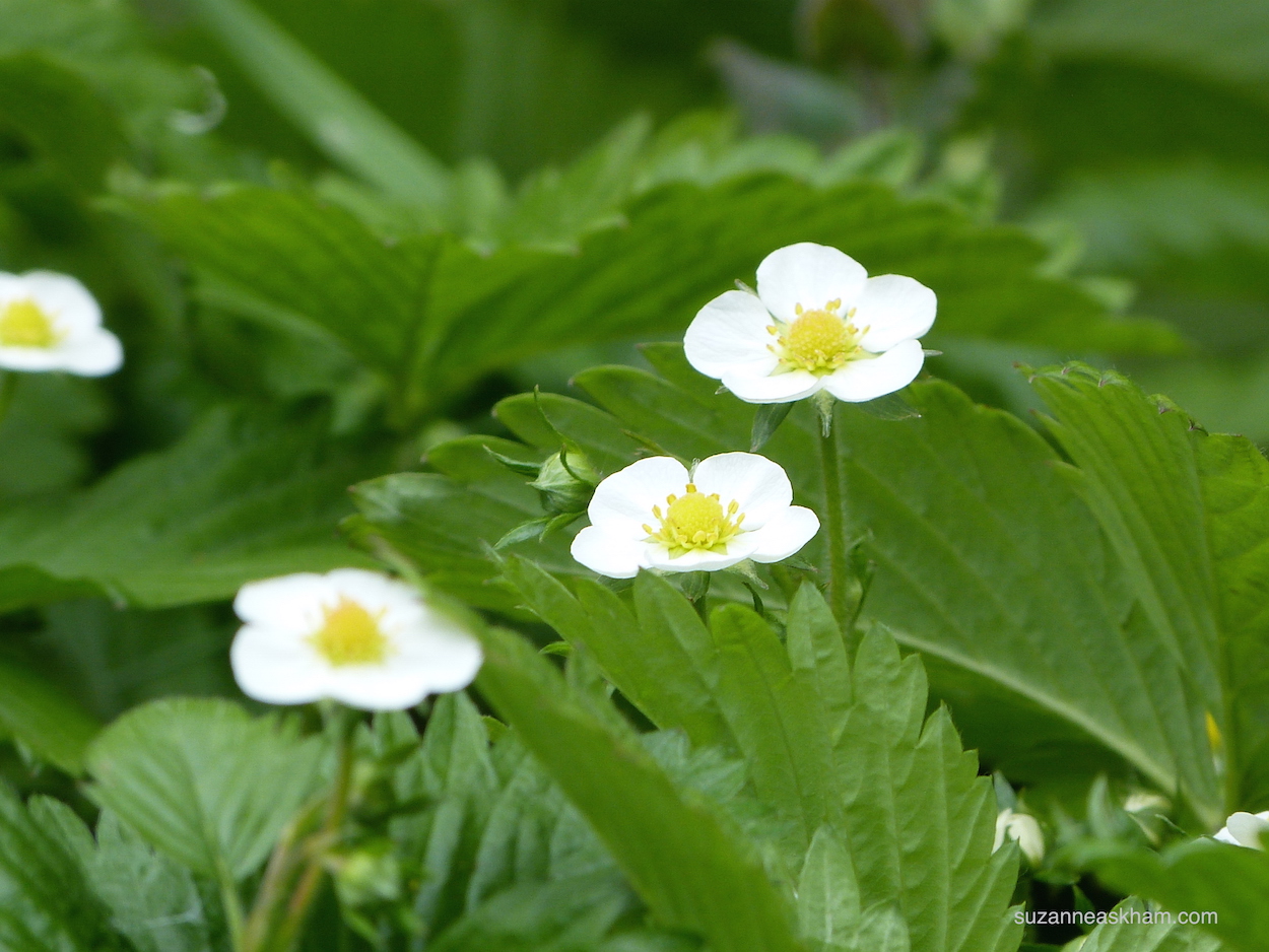 Fragaria viscera grows prolifically as ground cover in my garden, on damp and partly shaded earth. It has even thrived in the gaps between paving stones. Many summers ago, my youngest used to sit naked, a Buddha baby, among the wild strawberry plants munching the tiny sweet crimson berries. I understood then that bliss is built into this little plant’s DNA.