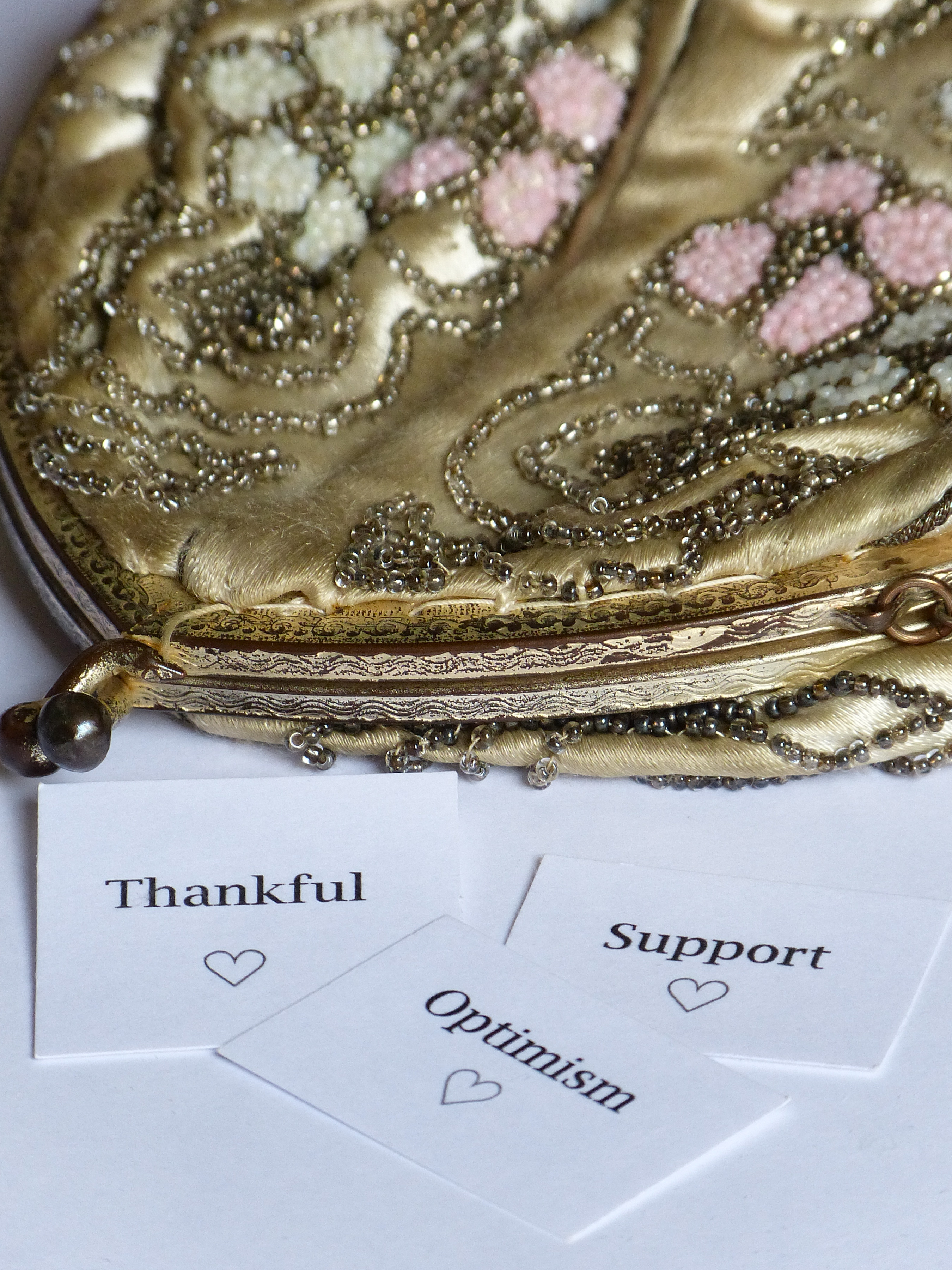 This is a special bag: a beaded evening purse; handed down through the generations of my family. My mother gave it to me one day last December.
