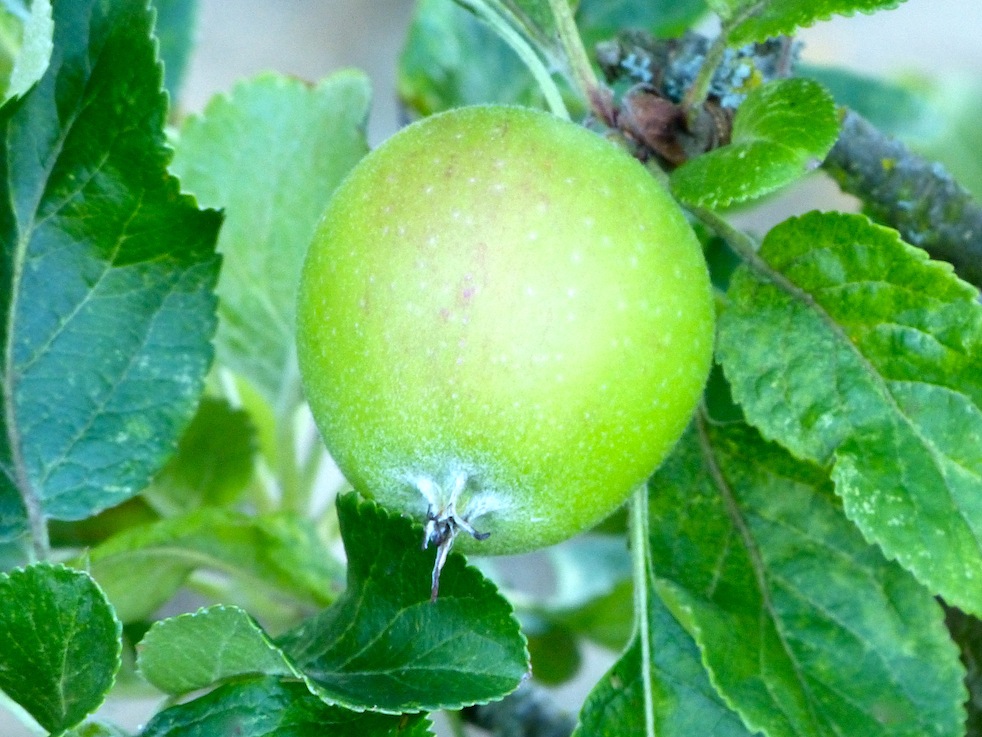 I walk by small trees laden with young apples, bursting with life and vitality.