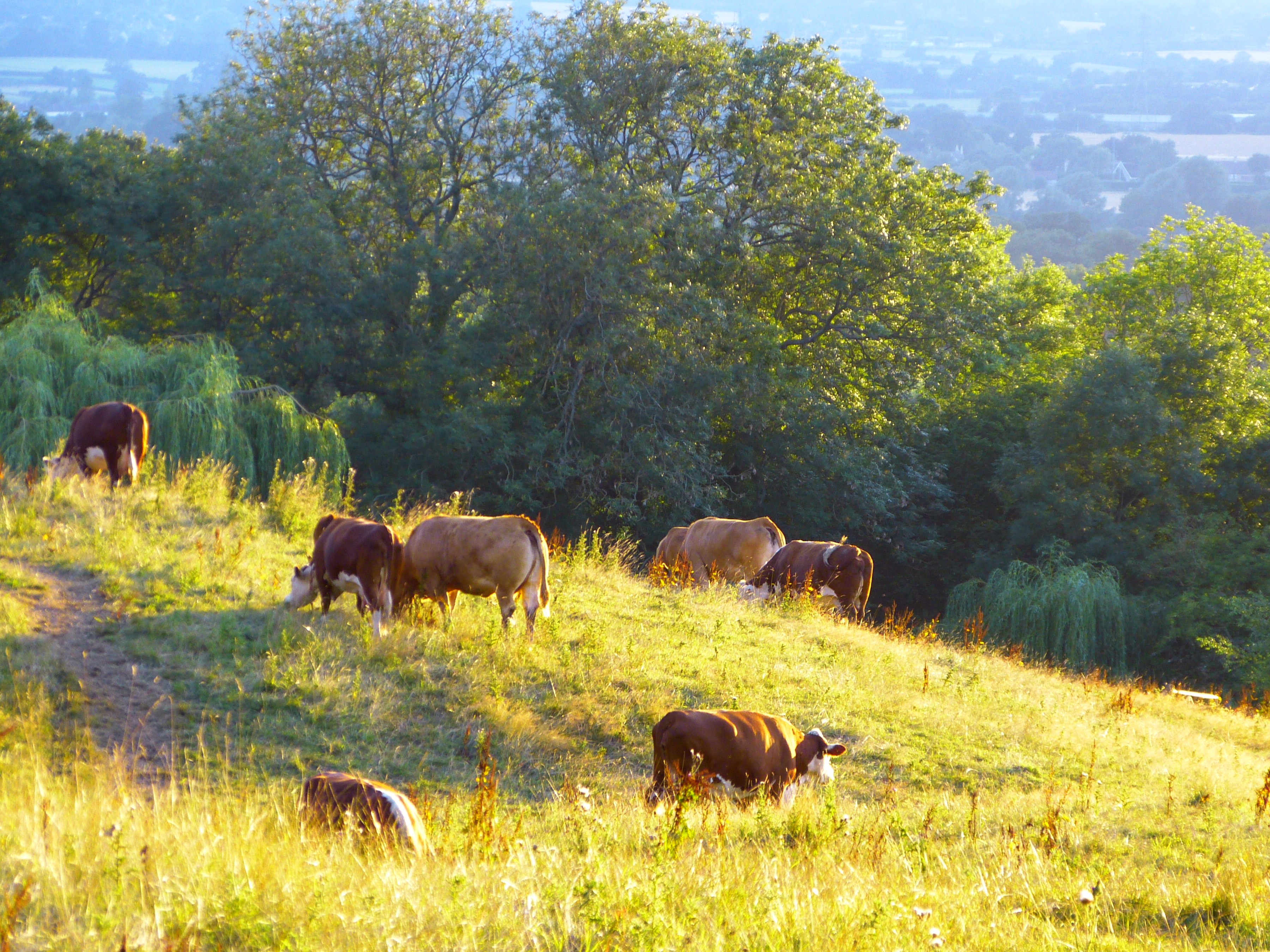 Beyond, on the hill, I see cows grazing in the sunlight.